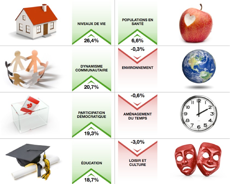 Sur les huit catégories de l'Indice canadien du mieux-être, six ont progressé et trois ont reculé.